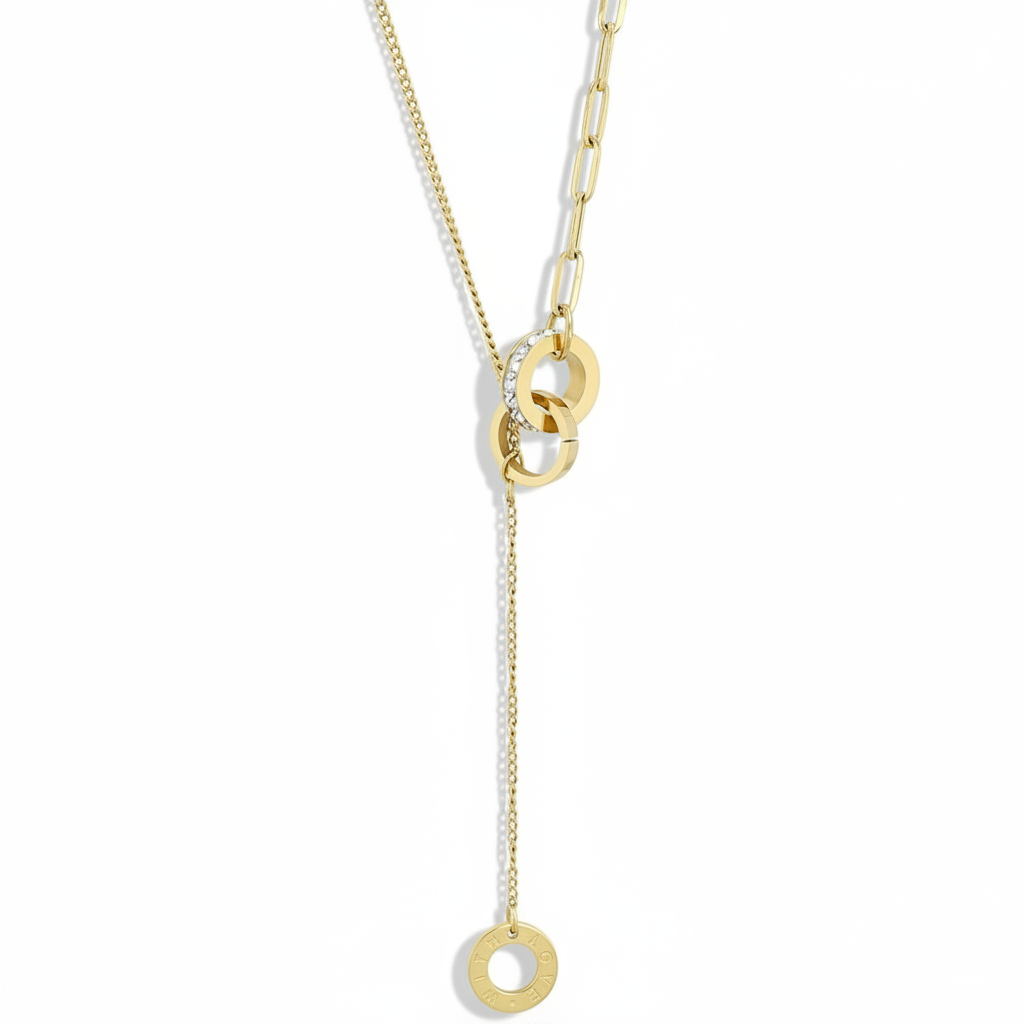 An beiden Kettenenden sind jeweils ineinander verschlungene Ringe angebracht, der größere rundum mit Similisteinen verziert und der kleinere mit dem Schriftzug "FOR EVER" graviert.